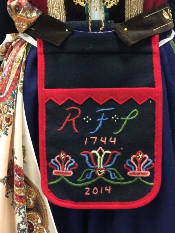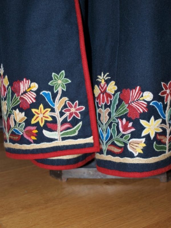 - Pils og svunta er úr bláu klæði með nýtísku blómamynstri