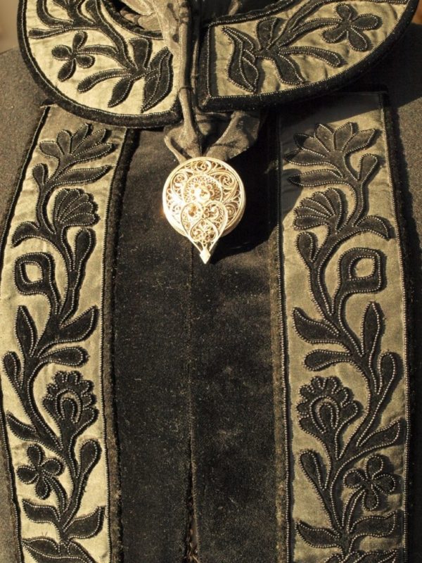 Framan á ermum eru oftast flauelisleggingar. Treyjan er krækt saman að framan.