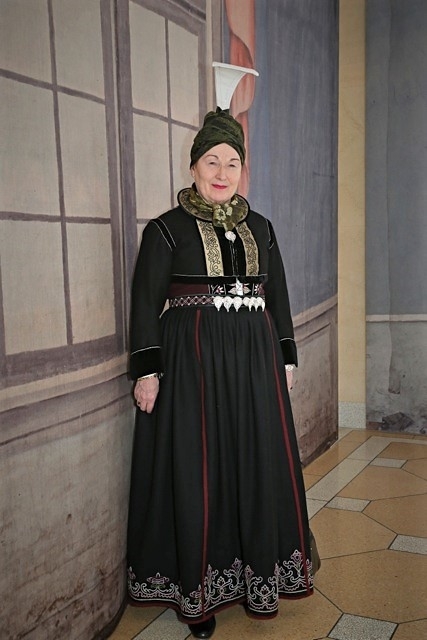 Auður í faldbúningi yngri með spaðafald. Klútur er bundinn utan um faldhúfuna svo spaðinn stendur upp úr