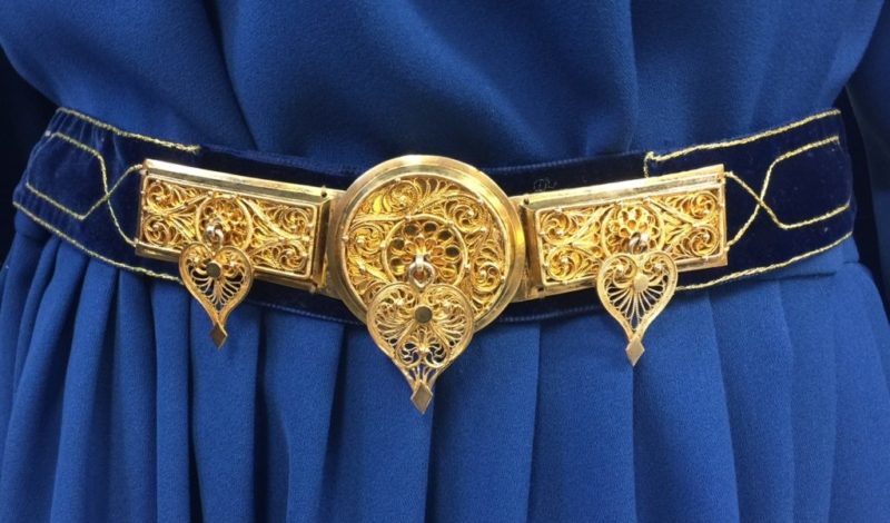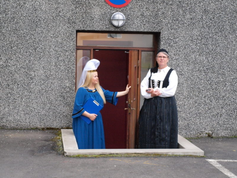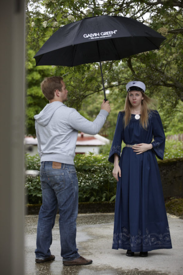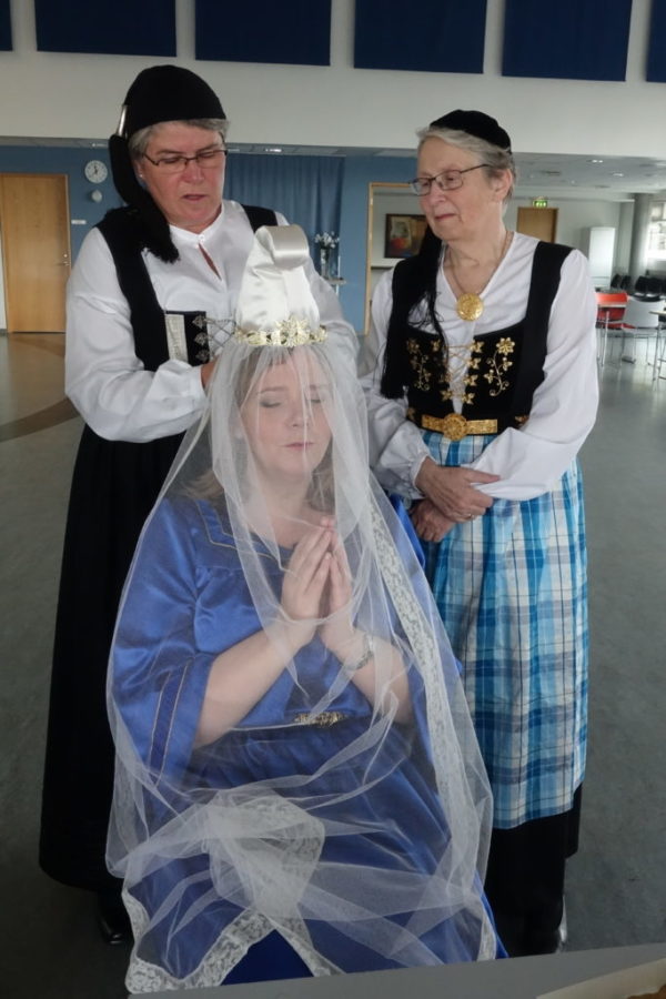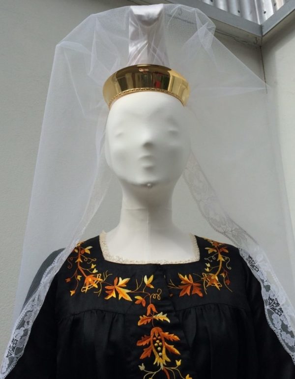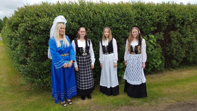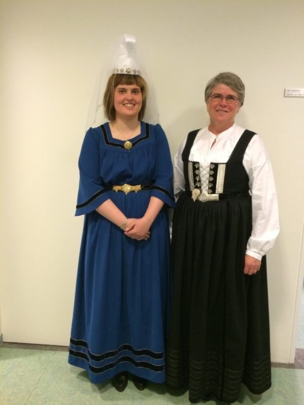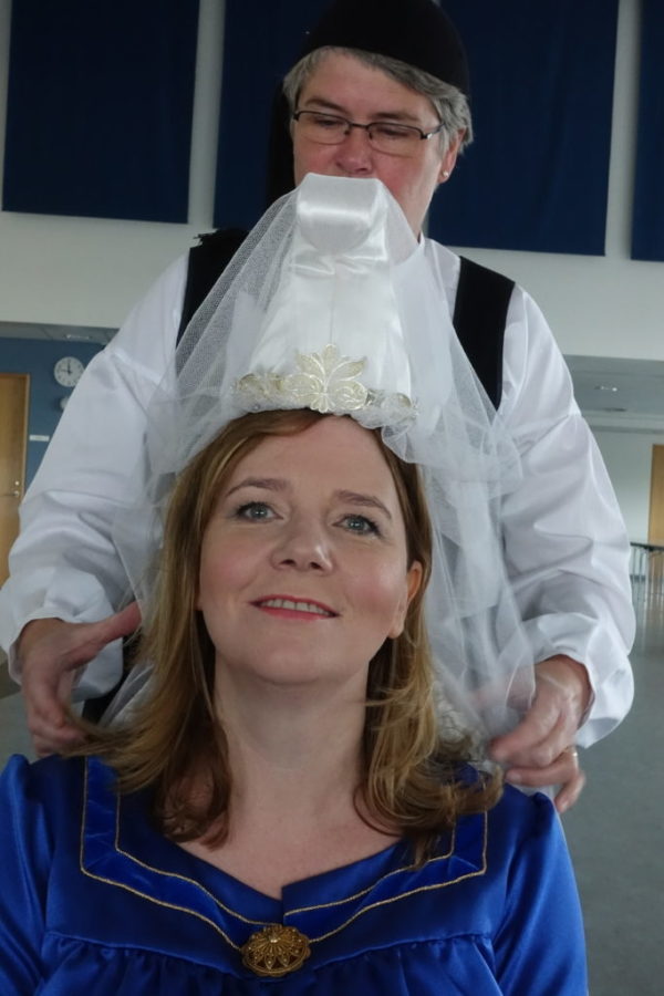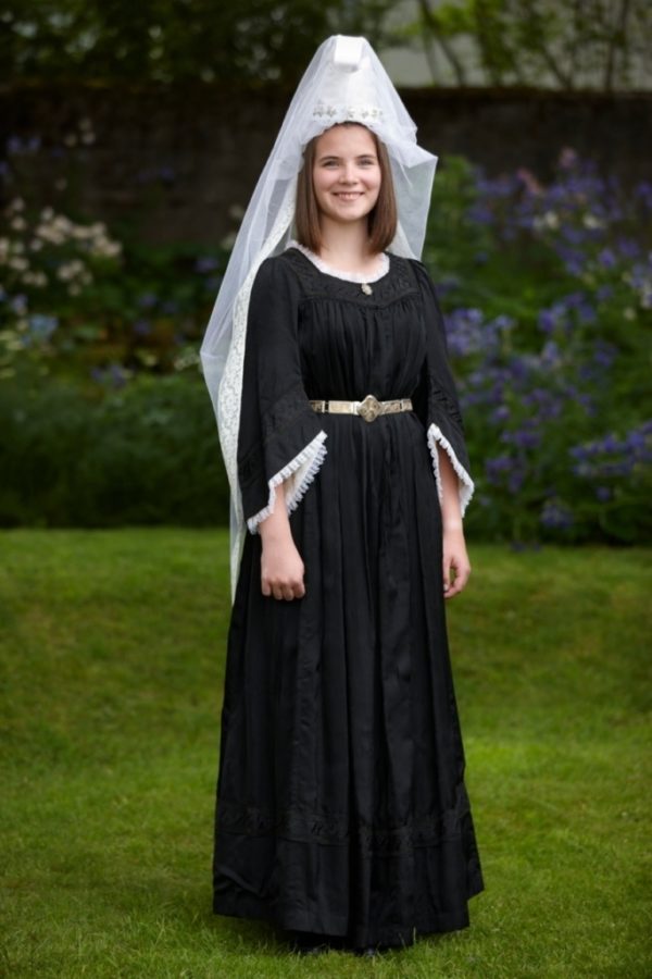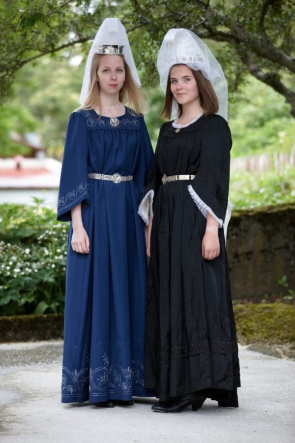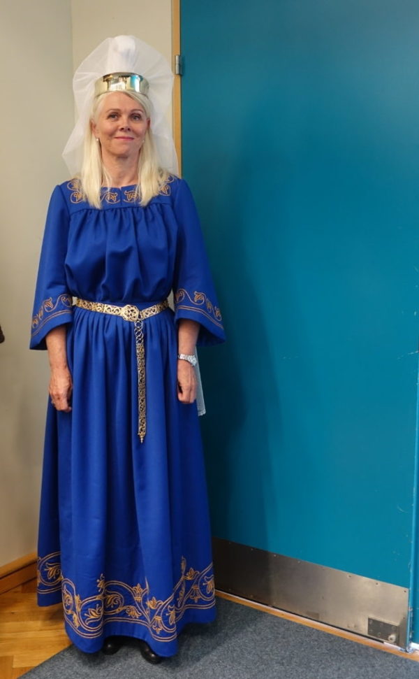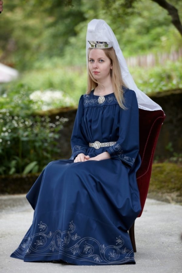 Bylgja Júlíusdóttir í kyrtli. Skreytingar eru saumaðar á berustykki, framan á ermar og neðan á fald