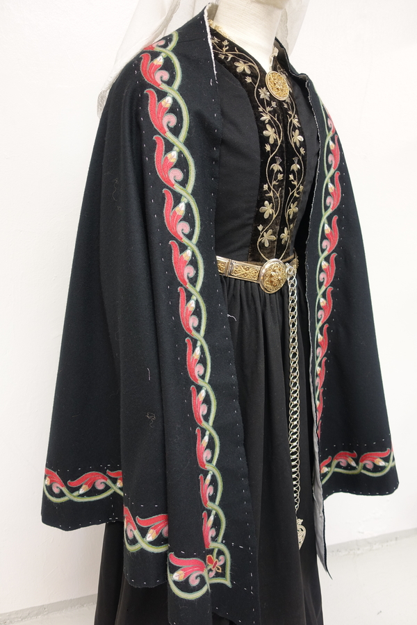 Möttullinn er hnýttur saman að framan með snúrum sem festar eru í hvora hlið. Hann er útsaumaður í útbrúnir allan hringinn.