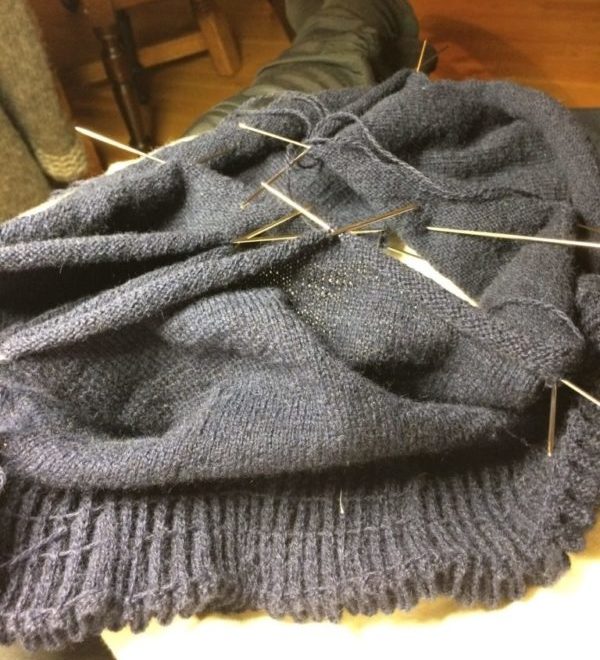 Þeim fækkar um meira en helming þegar stakkurinn er dreginn saman. Fyrir þennan lykkjufjölda þarf mjög fínt ullarband og prjóna nr. 1,25. Í þessari peysu var notað innflutt húfuband.